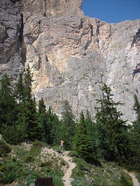 Joe reaches the top (ish) of the first Langazuoi tower. We then abseiled and went on to climb the 2nd Langazuoi tower. Grade 4+ again I think. Height gain something like 400m when added together. About 10 pitches.