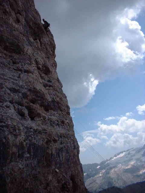 Joe tackling the crux on a super exposed pitch on the Pordoispitze towers which terminate on the cablecar viewing platform.Vertical height gain of the route ~350m. Grade 4+ - gear placements ~5 (on the entire route!).